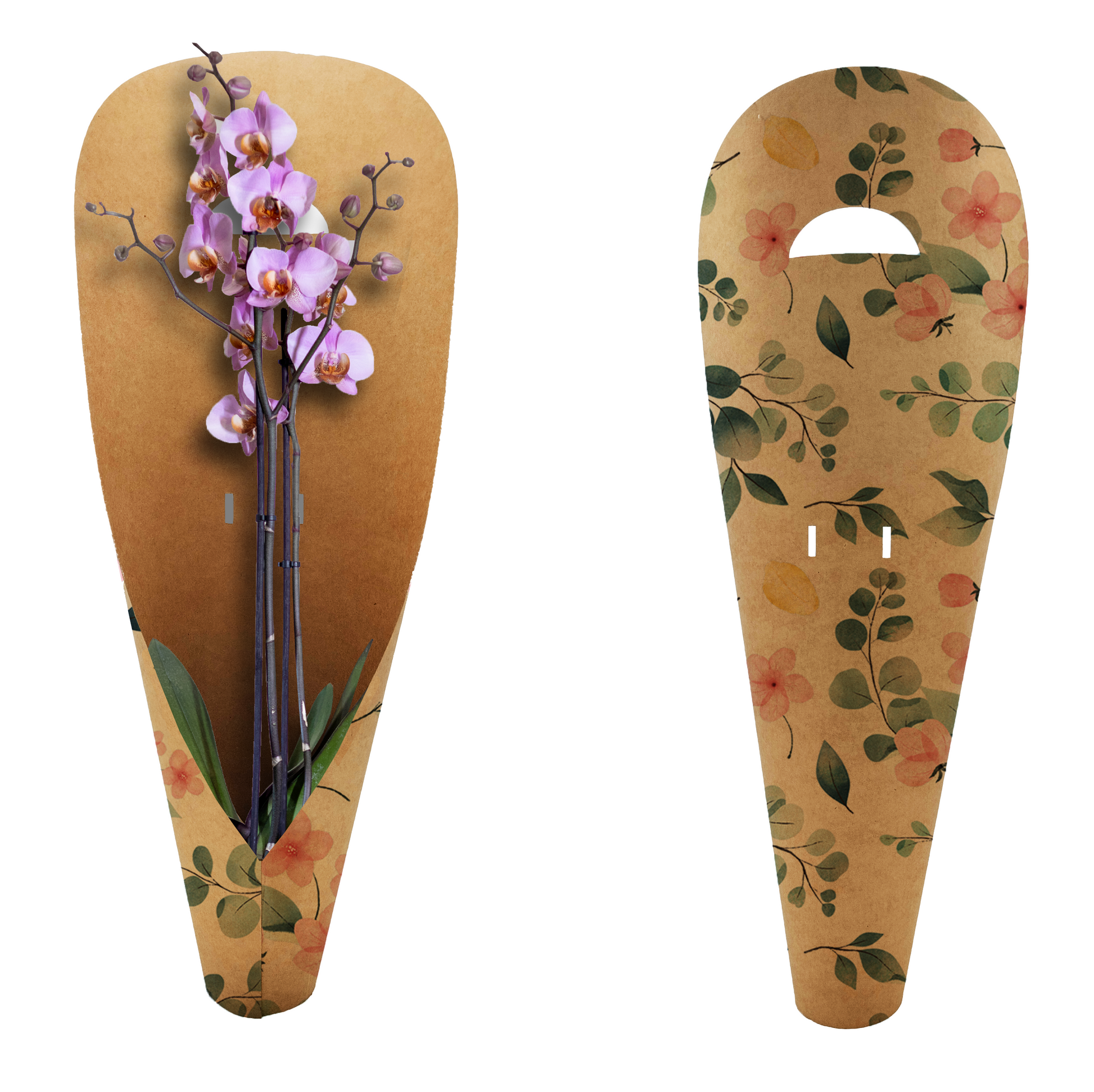 Made from sturdy 300gsm Kraft paperboard, it features elegant designs and fits single or double stem orchids.