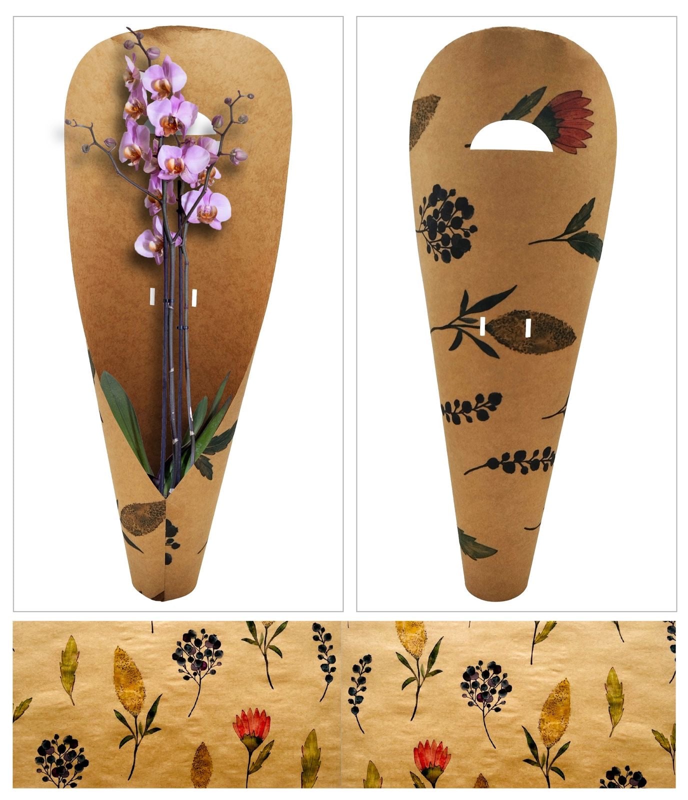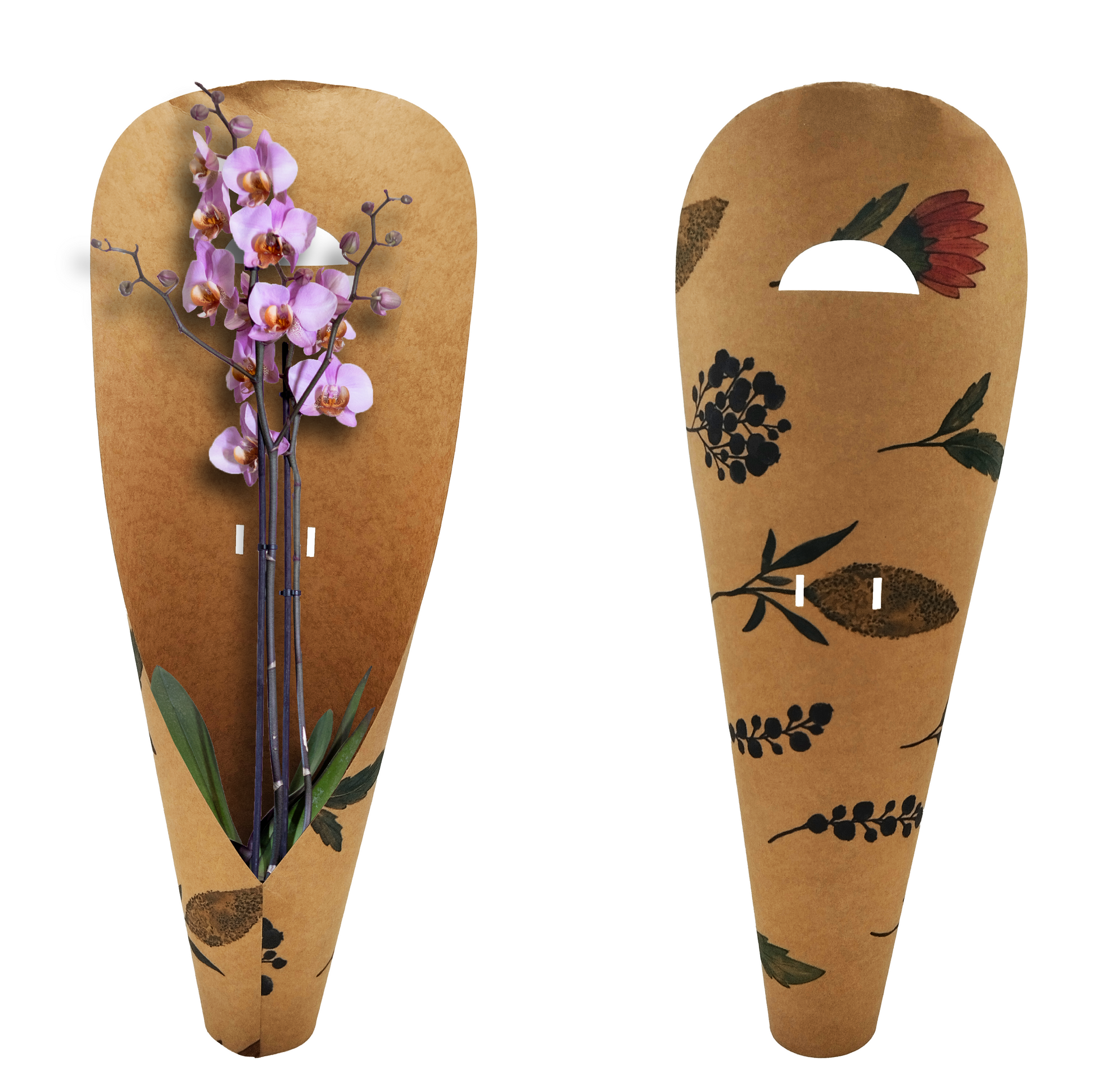 Made from sturdy 300gsm Kraft paperboard, it features elegant designs and fits single or double stem orchids.